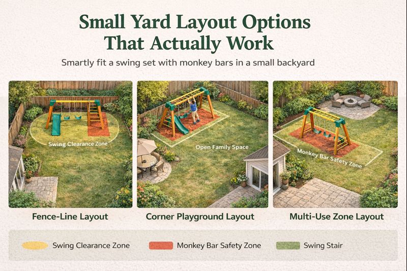 Swings need extra clearance in front and back. Monkey bars need clearance on the sides. Your goal is: no tight squeeze near fences, walls, or garden beds.